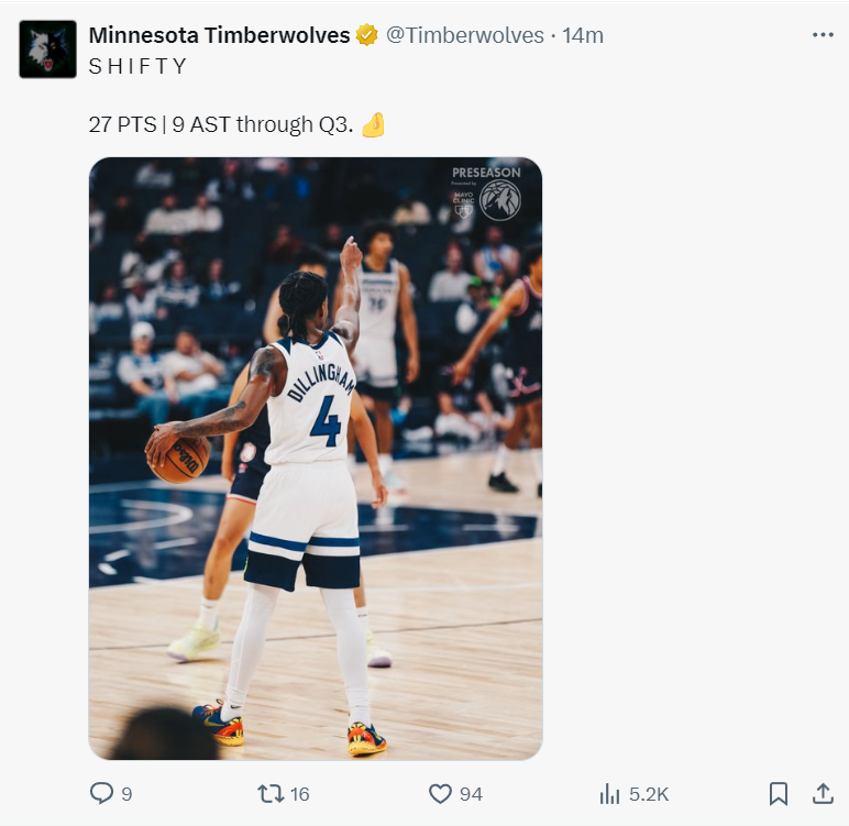 森林狼的先发后卫迪林厄姆三节27分钟打卡,14中10,三分4中4,罚球4中3,拿到27分9助攻2篮板2抢断仅1失误,命中率71.4%,三分命中率100%,这才是核心应该有的表现。