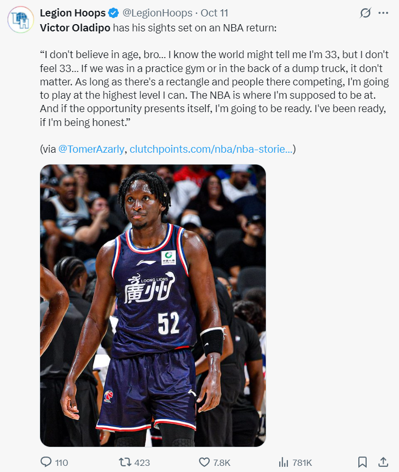 33岁的奥拉迪波想要重返NBA难度还是不小,虽然此前两场季前赛发挥还行,可第三场立马拉了,外界的风评也会下降,而且也没有什么球队跟他传出绯闻。