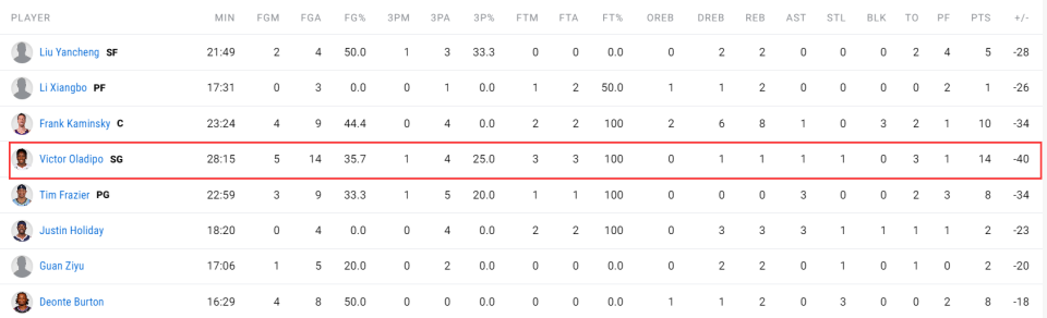 奥拉迪波28分钟,14中5,三分4中1,罚球3中3,拿到14分1篮板1助攻1抢断,命中率35.7%,三分命中率25%,正负值-40(全队最差),奥迪这一场比赛算是被打爆了。